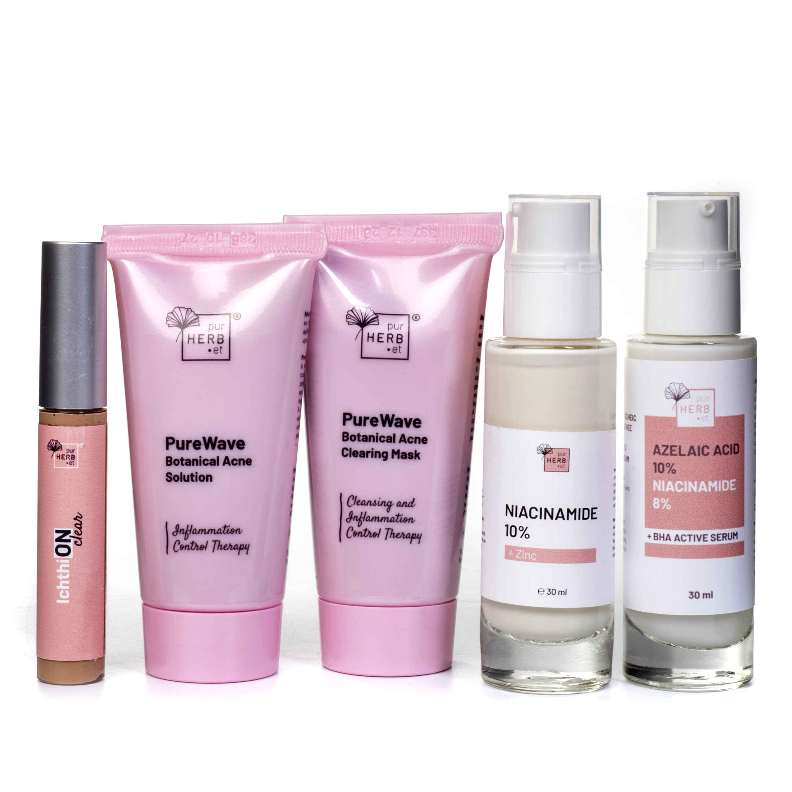Un set complet care ajută la calmarea inflamației, reglarea sebumului, curățarea porilor și estomparea urmelor lăsate de acnee, în timp ce susține regenerarea pielii.